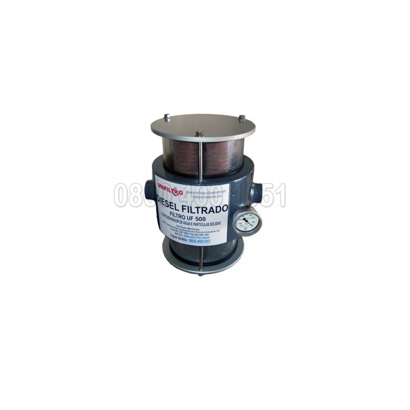 Filtro com efeito desidratador e visores que permitem o cliente visualizar o processo de filtragem e a água separada do óleo diesel e biodiesel.