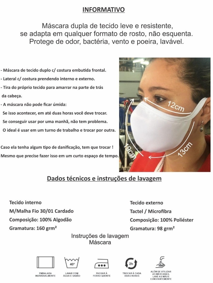 • Fabricada em tecido 100% algodão, conforme recomendado pela O.M.S