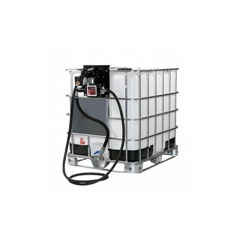 Reservatório em polietileno e porta-palete em aço (IBC), com propulsora pneumática, filtro regulador de ar, mangueira de sucção e conjunto preparador de ar.