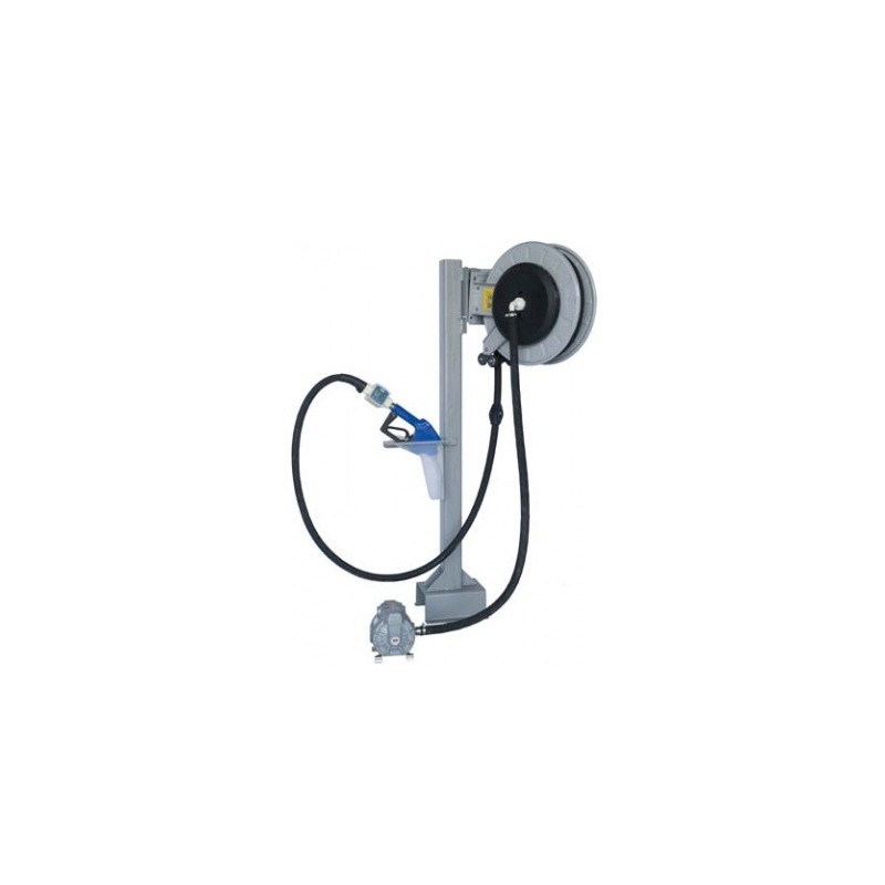 Completa, com bomba de duplo diafragma em hytrel e esferas em acetal, com filtro, mangueiras, bico de abastecimento, carretel, medidor e suportes.
