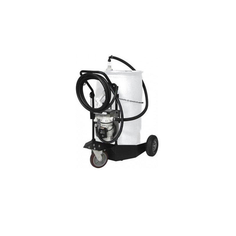 Em aço, para tambores de 200 L, com carrinho com rodas pneumáticas, bomba de diafragma, suporte para fixação, bico de abastecimento, mangueiras e conexões.